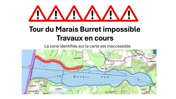 A partir du mercredi10 septembre 2025, le chantier situé sur le marais Burret se déplace. La nouvelle zone fermée au public est mentionné...