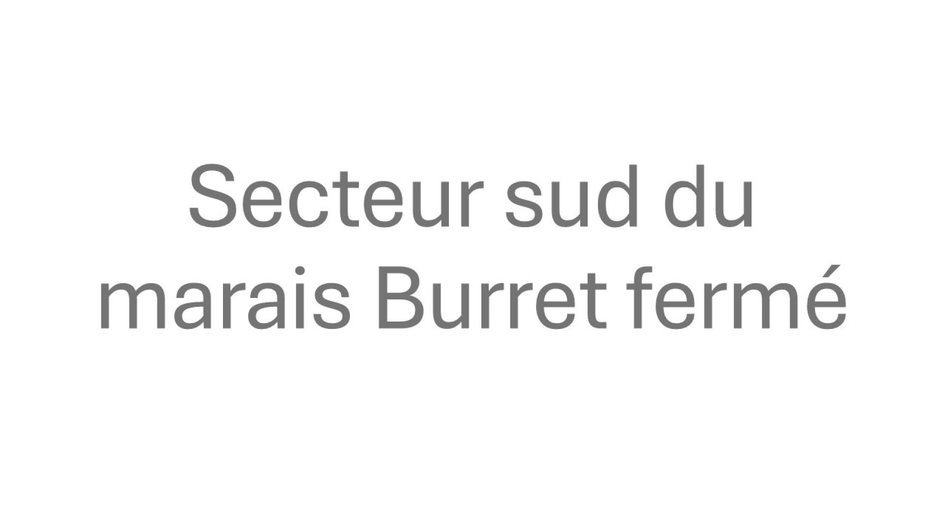 Secteur SUD du marais Burret fermé Secteur SUD du marais Burret fermé Publié le 22 août 2025 / Dernière modification le 23 octobre 2025 Secteur SUD du marais Burret fermé Publié le 22/08/2025 - Dernière modification le 23/10/2025 En raison des travaux d'entretien, le secteur sud du marais Burret est fermé au public.