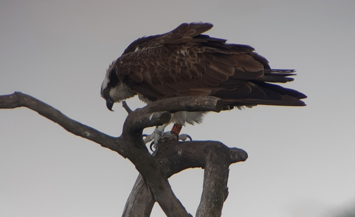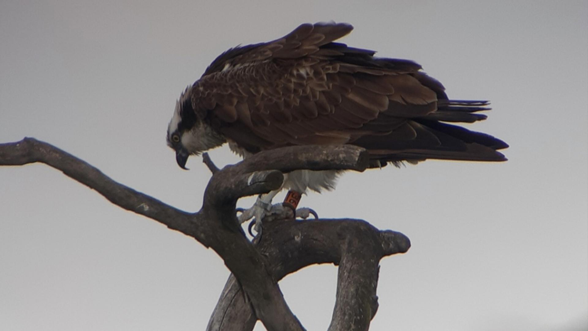 Mi-mai 2023, c’est avec enthousiasme que nous découvrons un balbuzard posé devant les perchoirs des volières de lâchers ayant servi de 2018 à 2021. Hormis les individus réintroduits sur ces années-là, rares sont les balbuzards qui se posent sur cette zone. Son identité a vite été révélée à l'aide d'une longue-vue. La femelle "T36 (orange)" fait partie des 8 derniers balbuzards qui ont été lâchés en 2021. Après 2 années passées sur sa zone d’hivernage, elle a repris son promontoire favori comme si elle ne l’avait jamais quitté. Une semaine plus tard, pensant immortaliser ce moment et lui tirer un nouveau portrait, c’est avec une joie immense que nous avons pu confirmer que cette fois son frère "T37 (orange)", était lui aussi de retour.